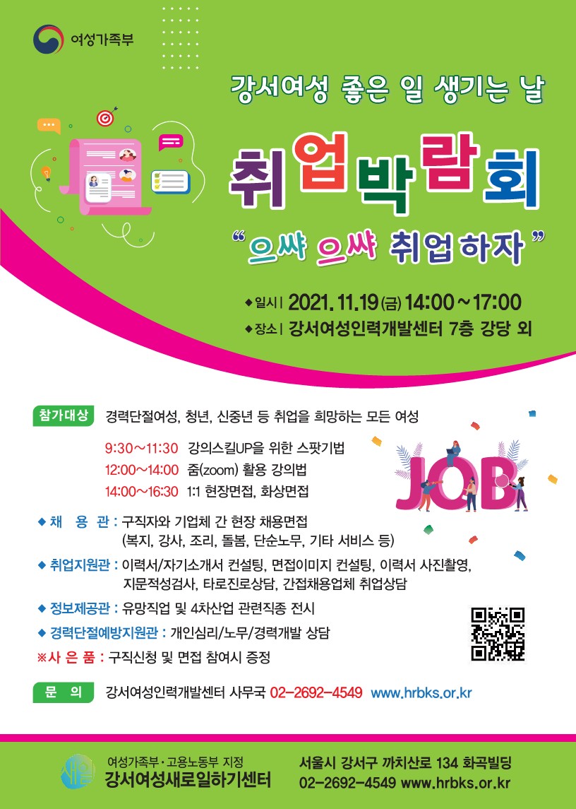 "으쌰으쌰 취업하자" 강서여성 취업박람회가 강서여성인력개발센터에서 진행될 예정입니다.