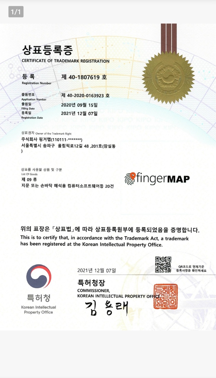소식특허청 상표등록[핑거맵] 출원 이전페이지 다음페이지 페이지 정보 작성자 최고관리자 쪽지보내기 메일보내기 자기소개 아이디로 검색 전체게시물 쪽지보내기 메일보내기 자기소개 아이디로 검색 전체게시물 작성일21-12-20 19:41 조회140,921회 댓글0건 추천 0 신고 목록 페이스북 공유 트위터 공유 구글+ 공유 게시글 내용 상표등록증 제 40-1807619호, 출원번호 제 40-2020-0163923호 지문 또는 손바닥 해석용 컴퓨터소프트웨어 등 20건에 대한 상표등록이 특허청으로부터 승인이 되었습니다. 댓글 0 댓글목록 등록된 댓글이 없습니다.