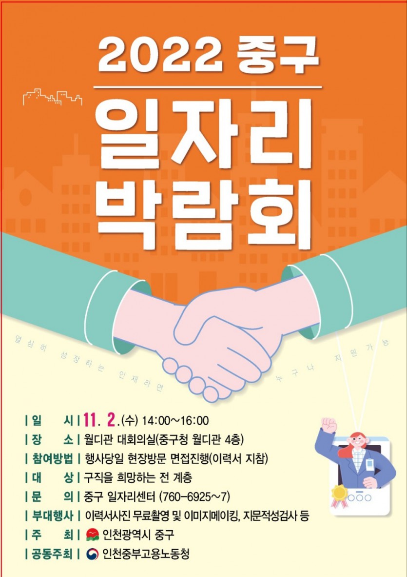2022 중구 일자리박람회 일정이 중구청 월디관 대회의실에서 에서 개최되며,