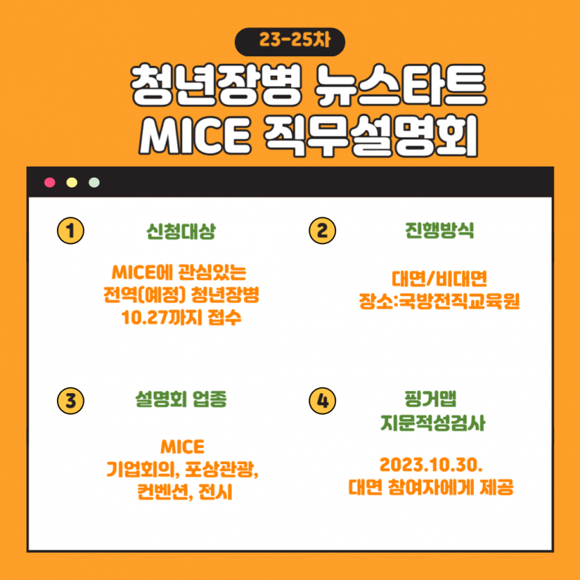 청년장병 뉴스타트 MICE 직무설명회 일정을 알려드립니다.