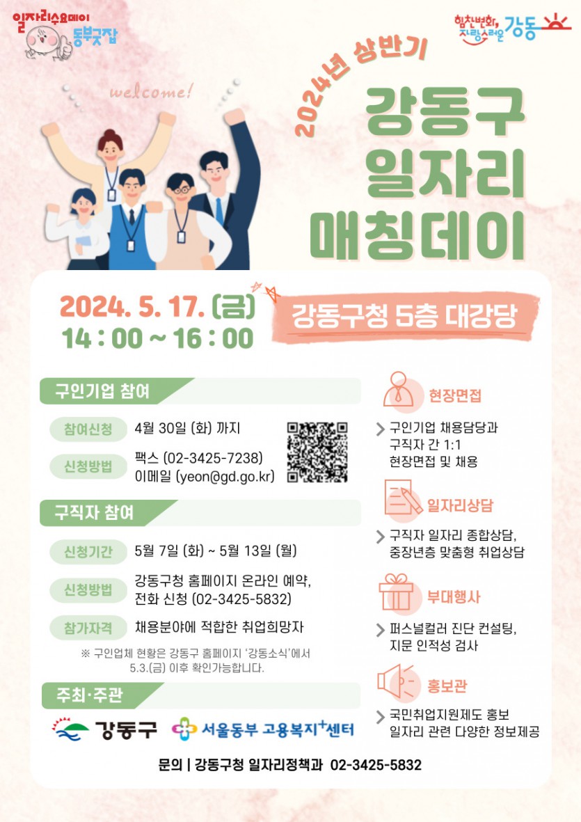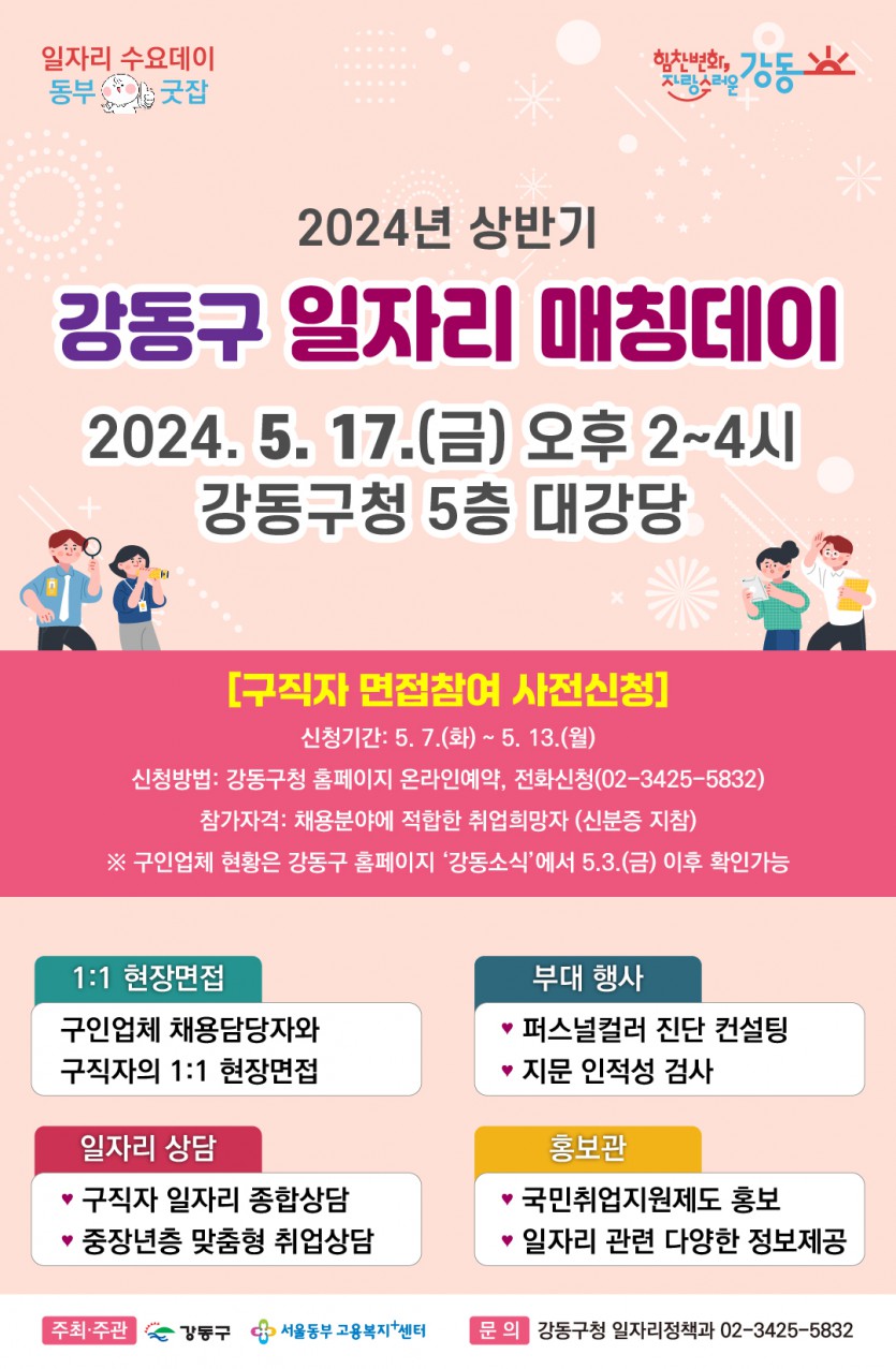 2024년 상반기 강동구 일자리 매칭데이가 5월 17일 오후2시~4시까지 강동구청 5층 대강당에서 진행되며,