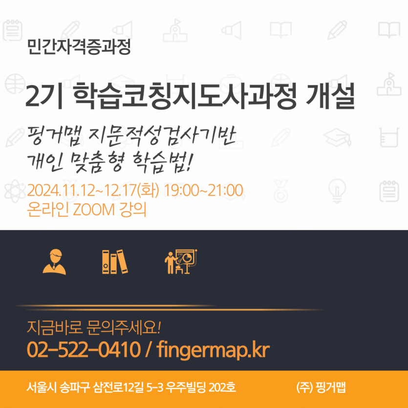 21년간 국내에 지문적성검사를 보급하면서 얻은 다양한 경험과 학습에 앞서 근본적인 점검을 통한 개인별 맞춤 학습전략을 통해 가장 효율적인 자기주도학습을 도와주는 학습코칭을 위한 전문가 양성과정을 개설하게 되었습니다.