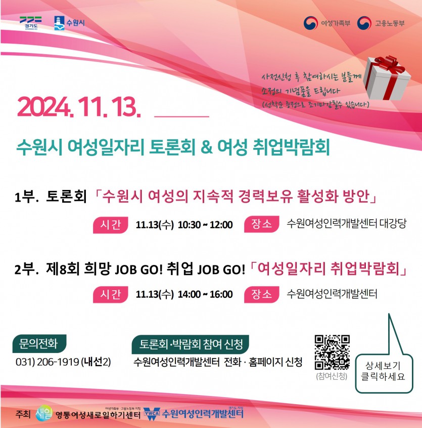 제8회 희망 JOB GO! 취업 JOB GO! , 2024 수원시 여성일자리 취업박람회가 수원여성인력개발센터에서 11월 13일 개최됩니다.