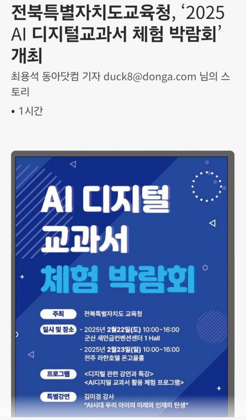 보도자료전북특별자치도교육청 2025 AI 디지털교과서 체험박람회 보도자료 이전페이지 다음페이지 페이지 정보 작성자 최고관리자 쪽지보내기 메일보내기 자기소개 아이디로 검색 전체게시물 쪽지보내기 메일보내기 자기소개 아이디로 검색 전체게시물 작성일25-02-20 12:40 조회42,659회 댓글0건 관련링크 https://www.msn.com/ko-kr/news/other/%EC… 25828회 연결 추천 0 신고 목록 페이스북 공유 트위터 공유 구글+ 공유 게시글 내용 보도자료 댓글 0 댓글목록 등록된 댓글이 없습니다.