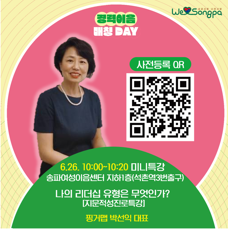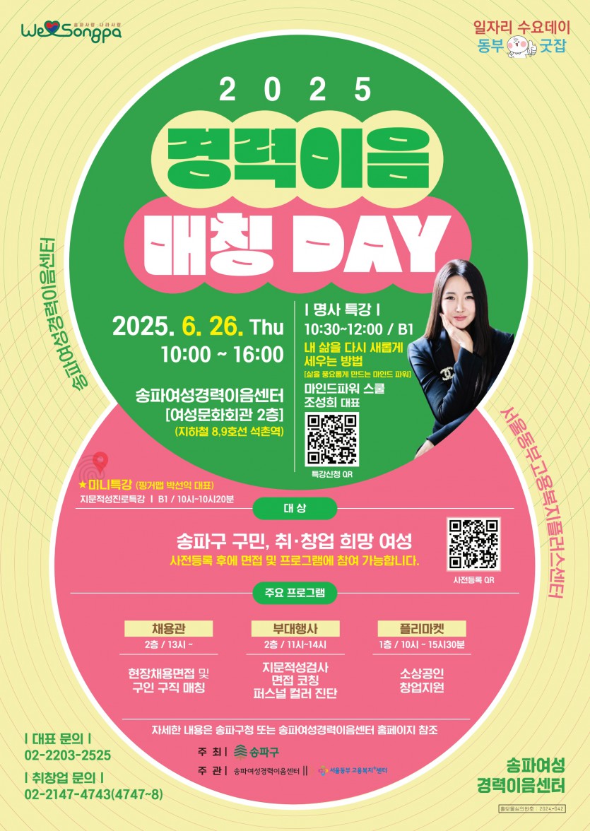 여성의 경력이음과 기업을 인재 채용을 지원하기 위한 [2025 송파이음경력매칭데이]가 6월26일 송파여성경력이음센터에서 진행되며,
