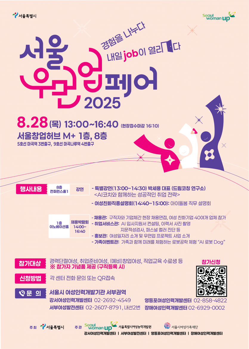 서울시 여성인력개발기관 서부권역 4개 기관에서 개최하는 2025 서울우먼업페어 행사가 서울창업허브에서 8월28일 개최되며,