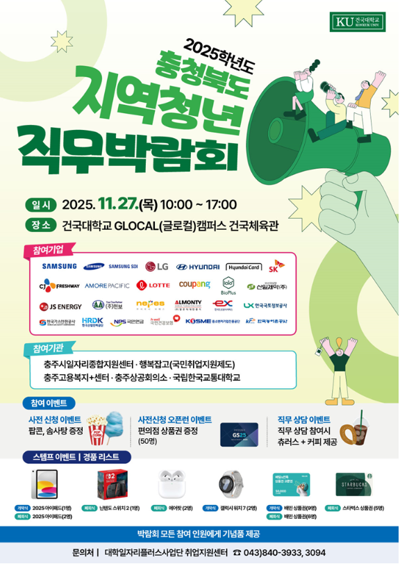 건국대 글로컬캠퍼스에서 2025 충청북도 지역청년 직무박람회가 개최됩니다.